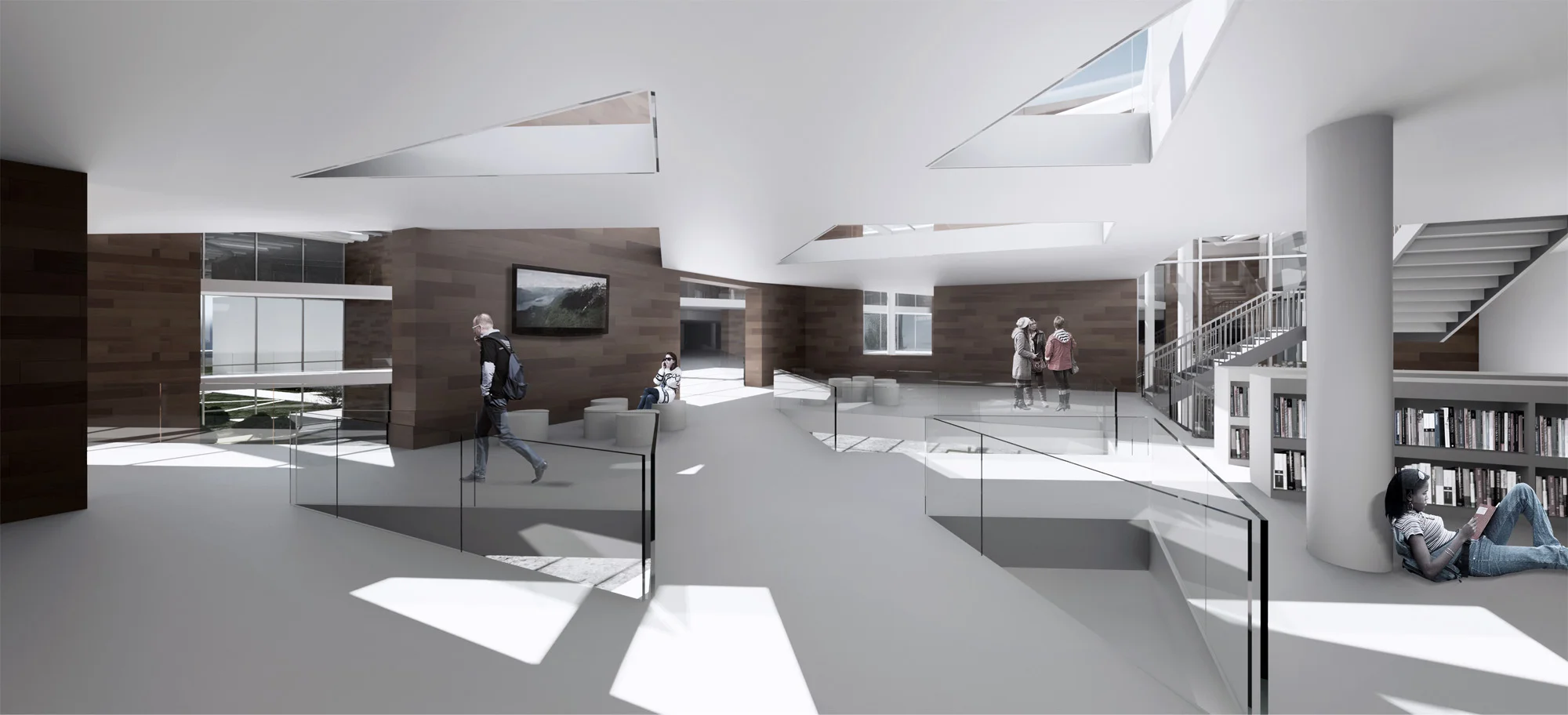 Further, internal connections within the building was important to the different required programs. In this case, the connections became celebrated in the form of bridges that puncture the programmatic masses inside. Conference Halls, galleries, a library, and restaurant are all encompassed in homogeneous wooden masses that are then pierced by these connecting bridges. This constant movement and visual interaction allows for a dynamic spatial experience and joins the programs with the people.
